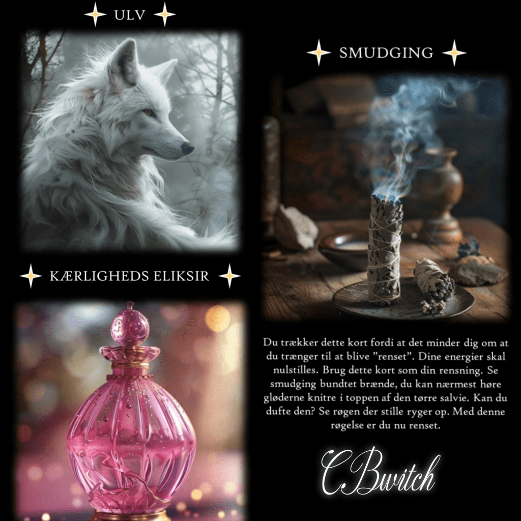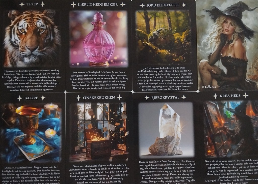 Magiske kort lavet med AI. Disse kort indeholder budskaber der er kanaliseret fra den spirituelle verden. Derfor er det netop denne energi der kommer til udtryk, når du trækker et kort. De visuelle billeder består af mange områder indenfor hekseri bl.a. Elementerne, krystaller, heksetyper, ønsker, månen, eliksirer og meget mere magi.